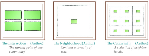 Examining growth in small towns is a great way to recognize the patterns of all our communities.  Because they are small, they are much more fragile environments and provide strong indicators of successful or unsuccessful growth.  Typically, every community starts with an intersection.  That intersection eventually experiences healthy growth and becomes a neighborhood.  The neighborhood has more than one use.  A collection of these mixed-use neighborhoods form a complete community.  Each community contains all necessary daily uses.  Theoretically, clusters of neighborhoods could continue indefinitely.  Because each is well-mixed, there is no sprawl condition forcing people to leave their community.  Yet, they still retain the freedom to visit other communities for specialized goods and services.  The following diagram illustrates the pattern of HEALTHY GROWTH.