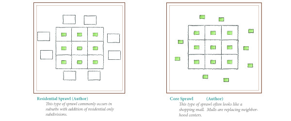 What exactly is sprawl?  Sprawl is an unhealthy growth pattern that doesn’t continue the traditional pattern illustrated above.  The traditional community is balanced.  There are suppliers and there are consumers.  Both are mixed evenly throughout the community in balanced neighborhoods.  In a sprawling community, there is a lack of balance.  The new developments are not mixed neighborhoods.  The consumer must transport themselves to a supplier region.  And similarly, the suppliers must depend on consumers outside their region.  The condition of sprawl implies that both do not occur in the same place.  For example, mass developments of housing is “residential sprawl” (see diagram on left below).  But sprawl can also be in the form of “core sprawl,” where the supply component of the neighborhood is developed without the consumers.  Shopping malls and office parks are examples of core sprawl (see diagram on right below).    Sprawl is synonymous with “incomplete neighborhoods.” It is the addition, or expansion, of neighborhoods with single-use only environments.